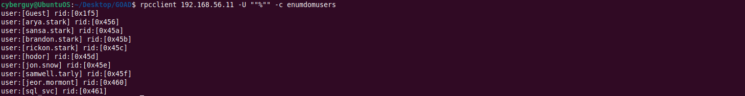 rpcclient 192.168.56.11 -U ""%"" -c enumdomusers